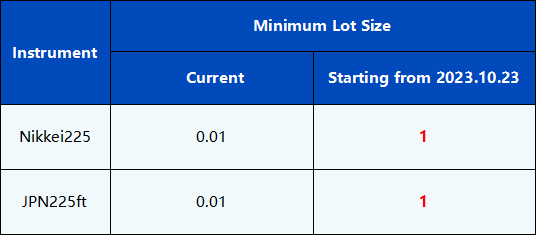 Please be advised that the minimum lot size of the following instruments will be adjusted starting from 23rd October 2023 to further optimise the competitiveness and improve the trading environment.
