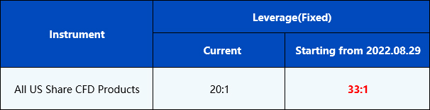 Please be advised that the leverage on all US Share CFDs products will be adjusted starting from 29th August 2022 to further optimise the competitiveness and improve the trading environment.