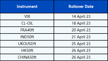 Please be advised that the following CFD instruments will be automatically rolled over as per the dates in the table below. As there can be a pricing difference between old and new futures contracts, we recommend clients to monitor their positions closely and manage positions accordingly.