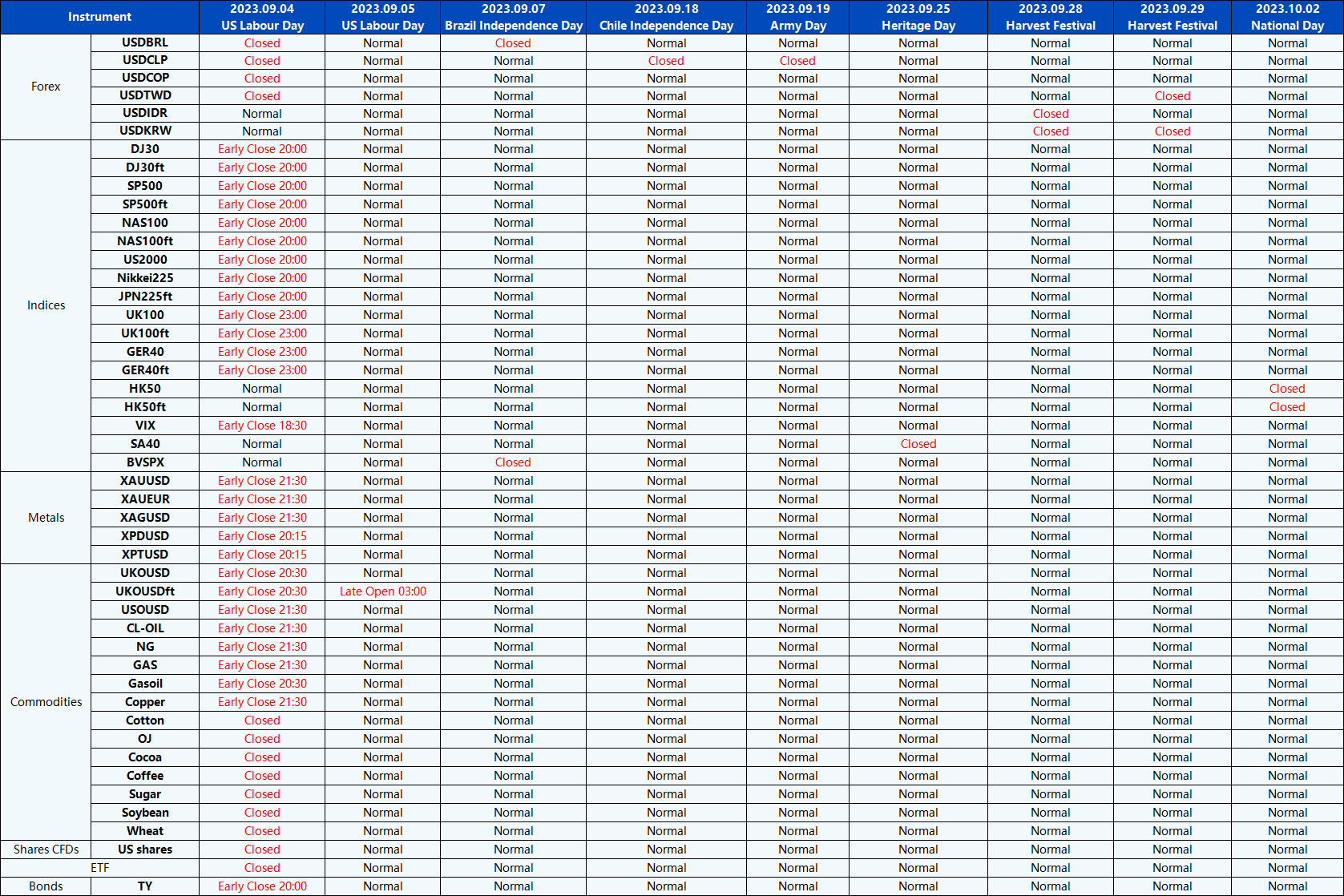 Please be advised that the following instruments’ trading hours and market session times will be affected by the upcoming September holidays.