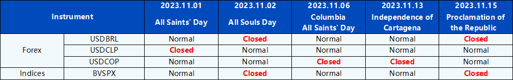 Please be advised that the following instruments’ trading hours and market session times will be affected by the upcoming November holidays.