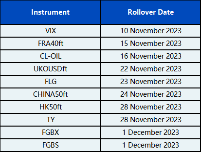 Please be advised that the following CFD instruments will be automatically rolled over as per the dates in the table below. As there can be a pricing difference between old and new futures contracts, we recommend clients to monitor their positions closely and manage positions accordingly.