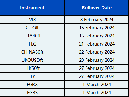 Please be advised that the following CFD instruments will be automatically rolled over as per the dates in the table below. As there can be a pricing difference between old and new futures contracts, we recommend clients to monitor their positions closely and manage positions accordingly.
