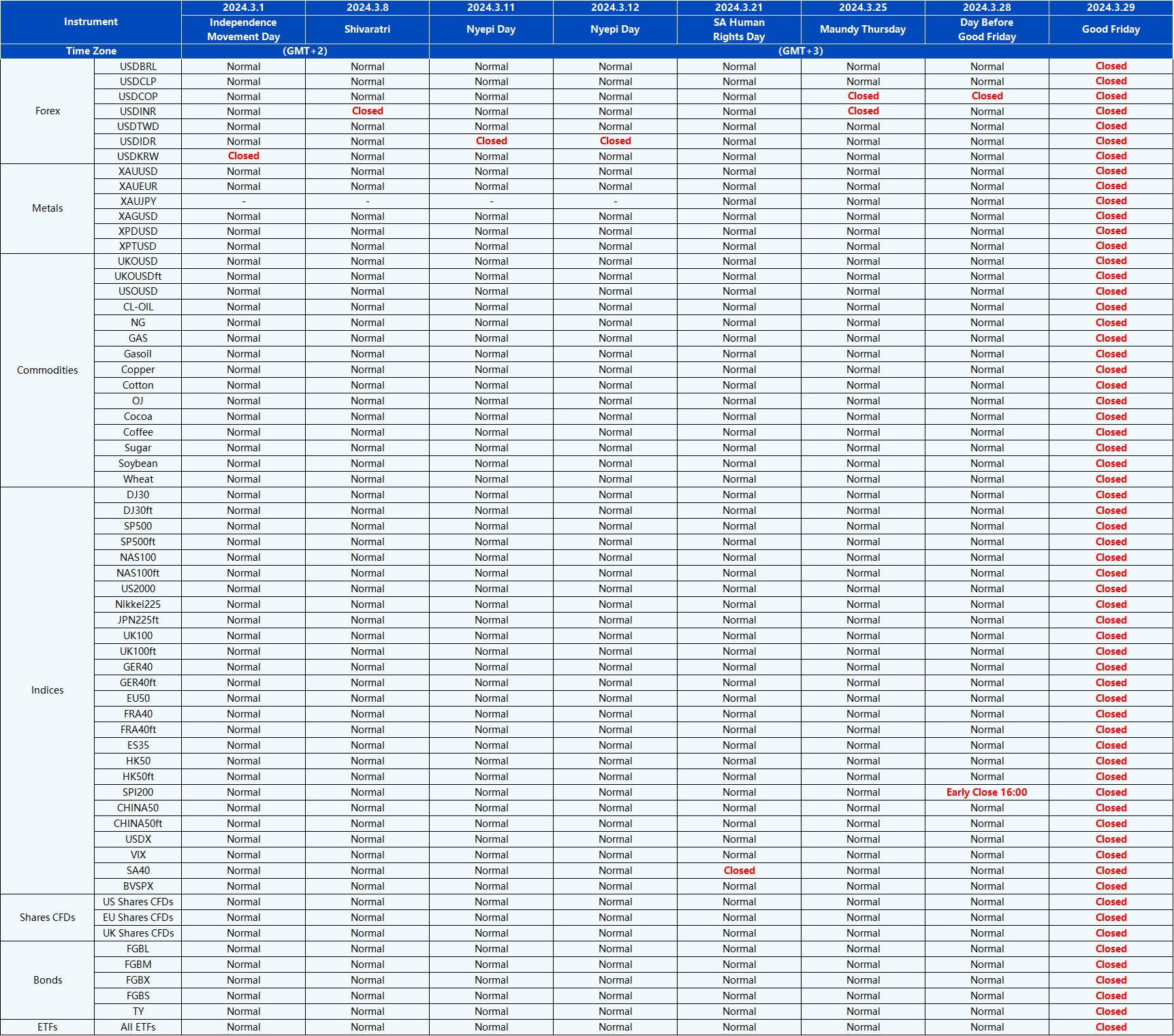 Please be advised that the following instruments’ trading hours and market session times will be affected by the upcoming March holidays.