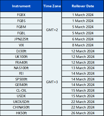 Please be advised that the following CFD instruments will be automatically rolled over as per the dates in the table below. As there can be a pricing difference between old and new futures contracts, we recommend clients to monitor their positions closely and manage positions accordingly.