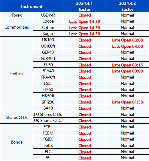 Please be advised that the following instruments’ trading hours and market session times will be affected by the upcoming Easter holidays.
