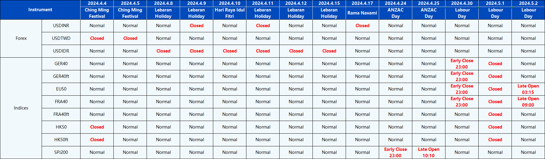 Please be advised that the following instruments’ trading hours and market session times will be affected by the upcoming April holidays and Labour Day.