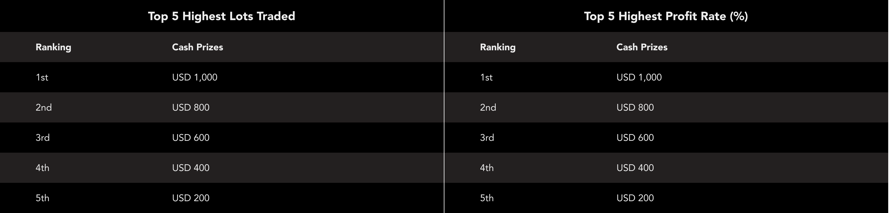 * Profit is calculated by every newly opened and closed orders made during the Competition period. Locked positions, and hedged positions do not count as valid orders for this promotion.
